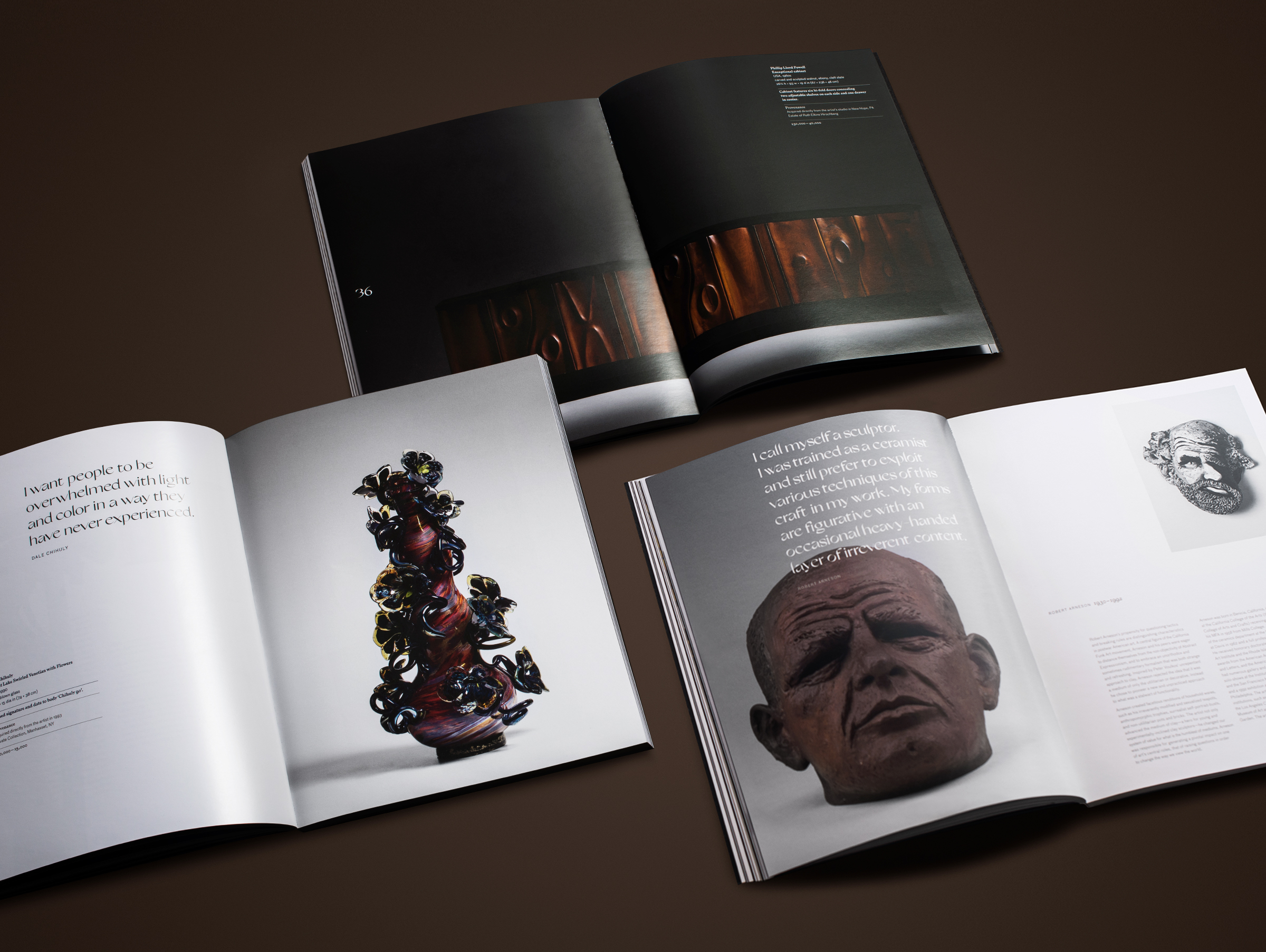 The commitment to showcasing the impeccable craftsmanship in this sale extended to every detail, including the careful selection of typography. The Grand Slang typeface, skillfully designed by Nikolas Wrobel, emerged as the perfect complement to the auction's identity. Drawing inspiration from mid-century American calligraphy, this distinct typeface seamlessly merged grotesque and serif letterforms, harmoniously blending tradition and modernity. The sleek aesthetic of the catalog was enhanced by the inclusion of scholarly texts, artist quotes, and alluring details, creating a captivating visual narrative that transcended the mere listing of lots.
